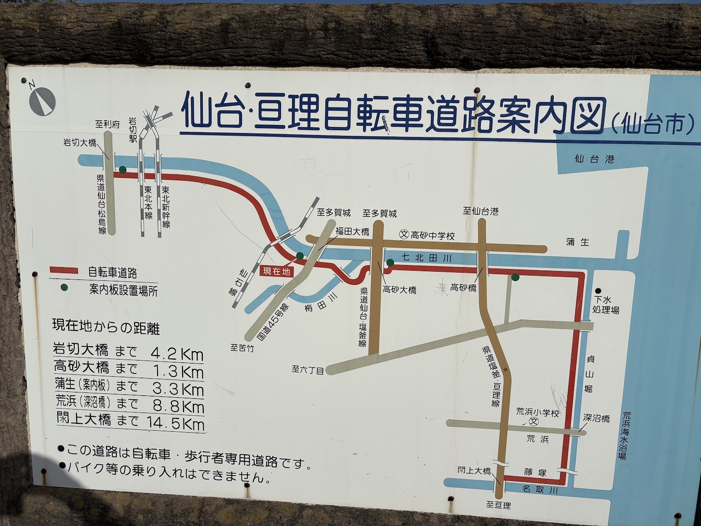 福田大橋から東北新幹線の高架橋下までの往復でおよそ9km。夜間のランニングも悪くはないが照明はなく視界不良となるため、夕暮れ時か早朝のランニングが良さそう